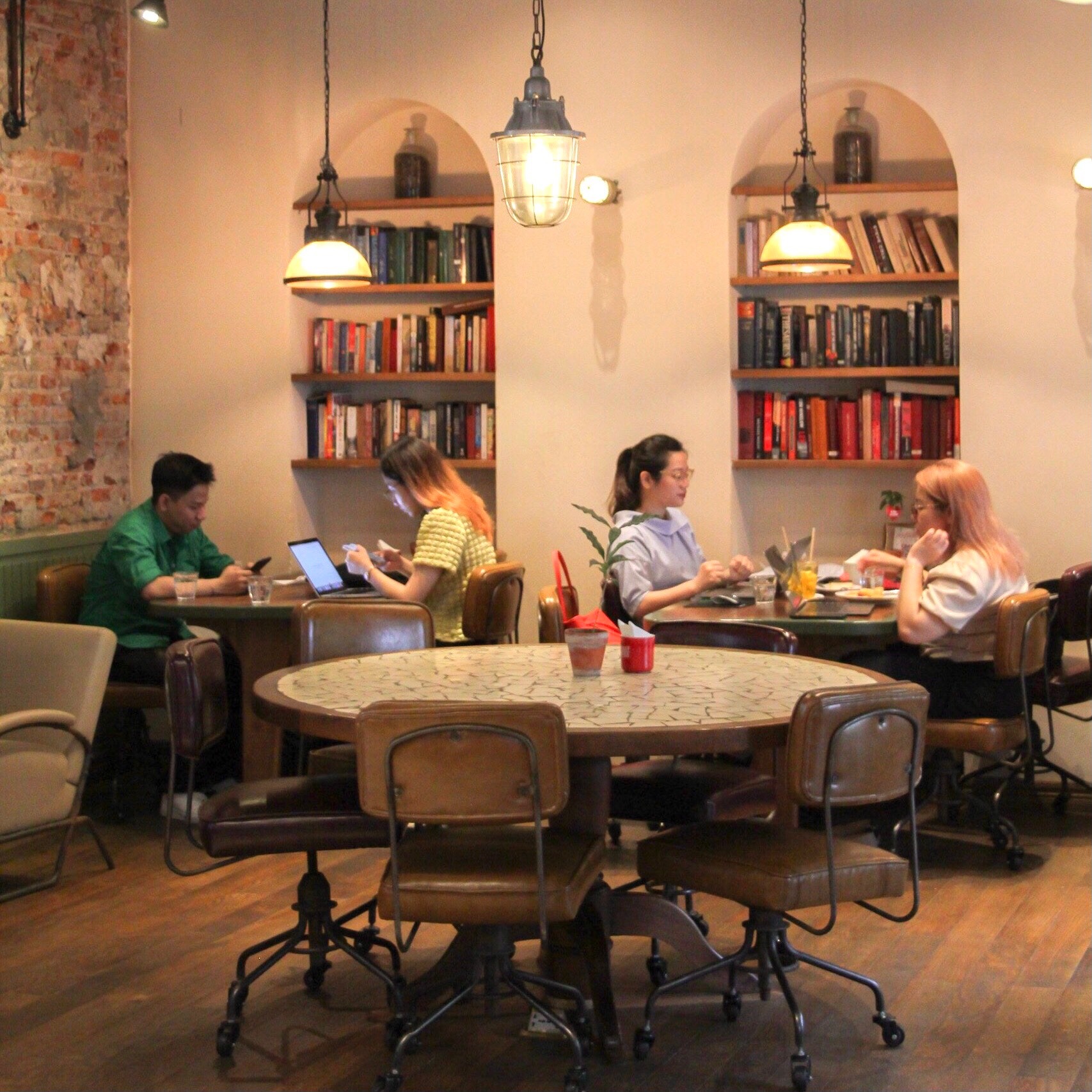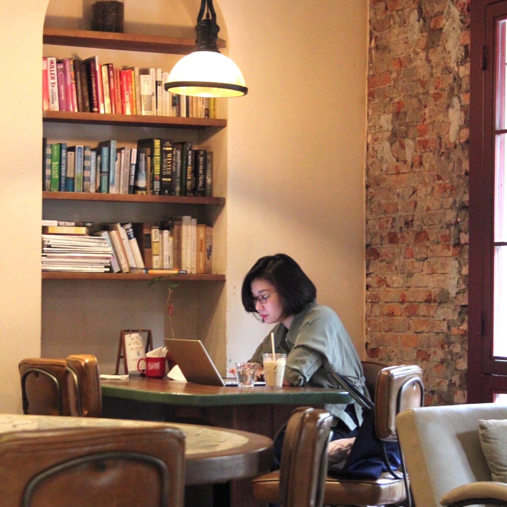 Tôi thường dành cả ngày làm việc dưới ánh đèn vàng ấm cúng, nơi không gian thơm mùi gỗ mộc mạc và mùi cà phê rang mới hàng ngày. Ngồi gọn gàng trên chiếc sofa thật êm, bên cạnh những kệ sách âm tường và lúc này bản nhạc “I fall in love too easily” đang vang lên thật nhẹ nhàng.