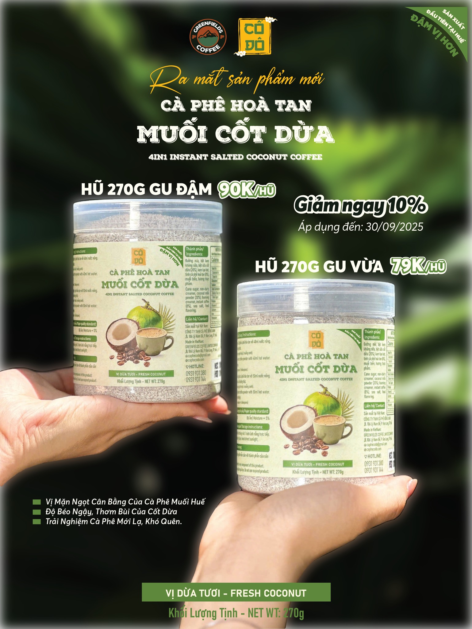 ⛩ Lần đầu tiên tại Huế, Cà Phê Đồng Xanh cho ra mắt sản phẩm mới “HŨ CÀ PHÊ HÒA TAN MUỐI CỐT DỪA” – sự kết hợp độc đáo giữa cà phê muối Huế đậm vị và cốt dừa béo ngậy, thơm bùi.