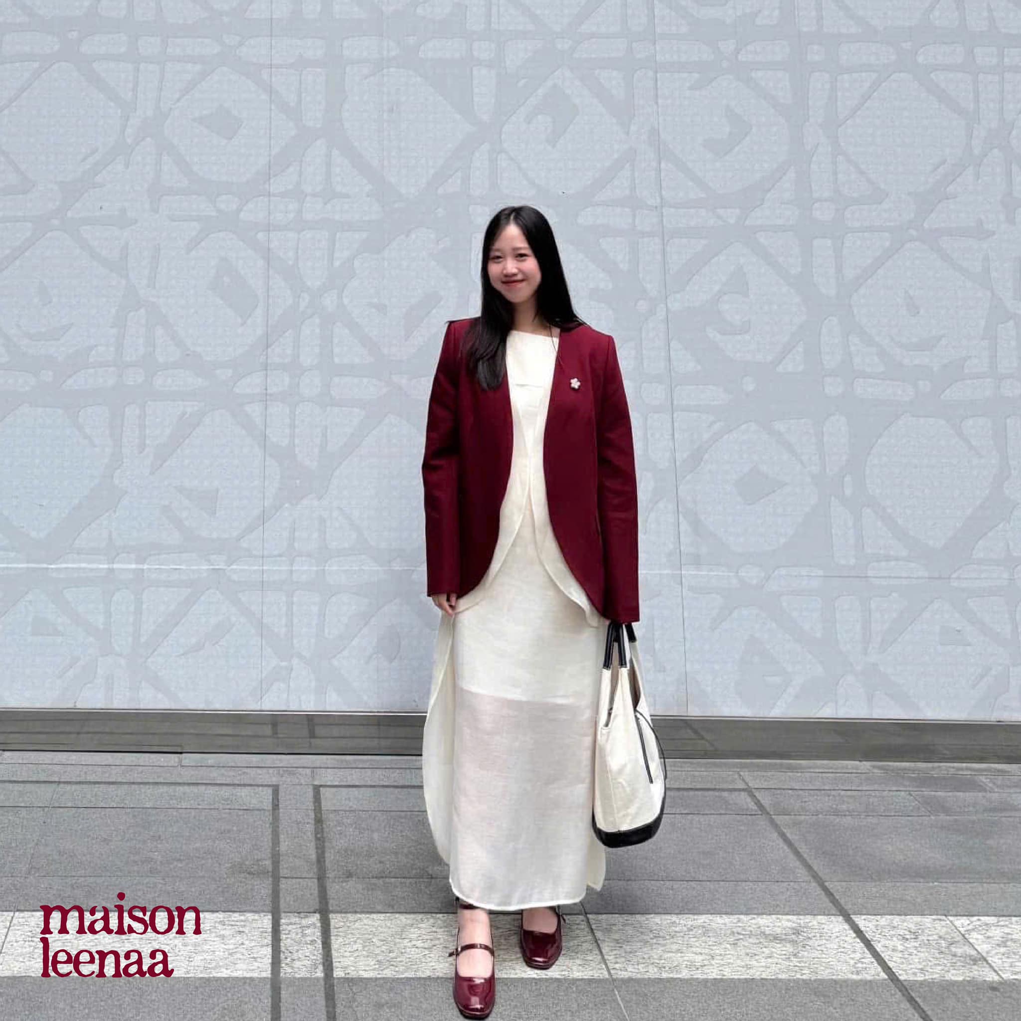 Cảm ơn nàng thơ Maison Leenaa đã chọn chiếc blazer đỏ rượu phối voan cho chuyến du xuân tới Hongkong.