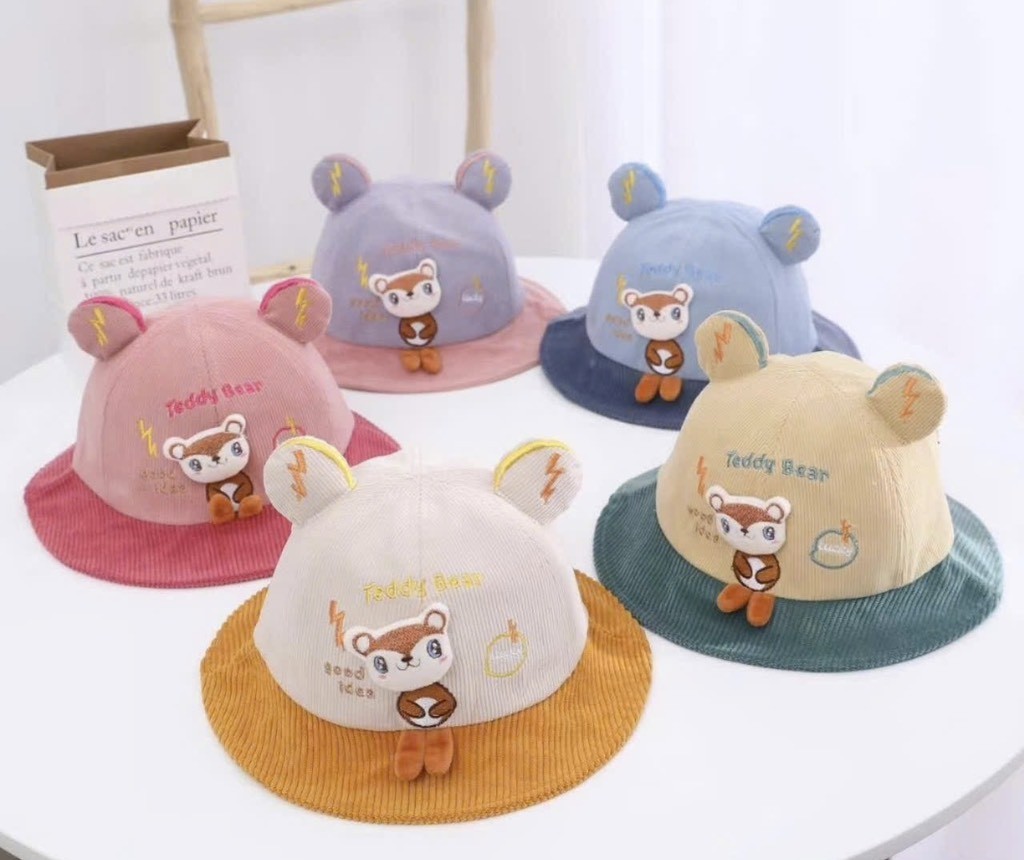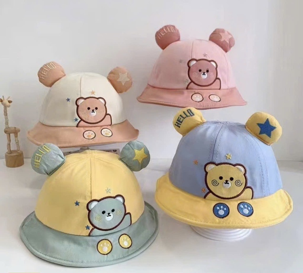 – Mũ thiết kế có tai gấu bông ngộ nghĩnh, cùng gam màu nổi bật, phía trước có thêu/gắn hình gấu cute
