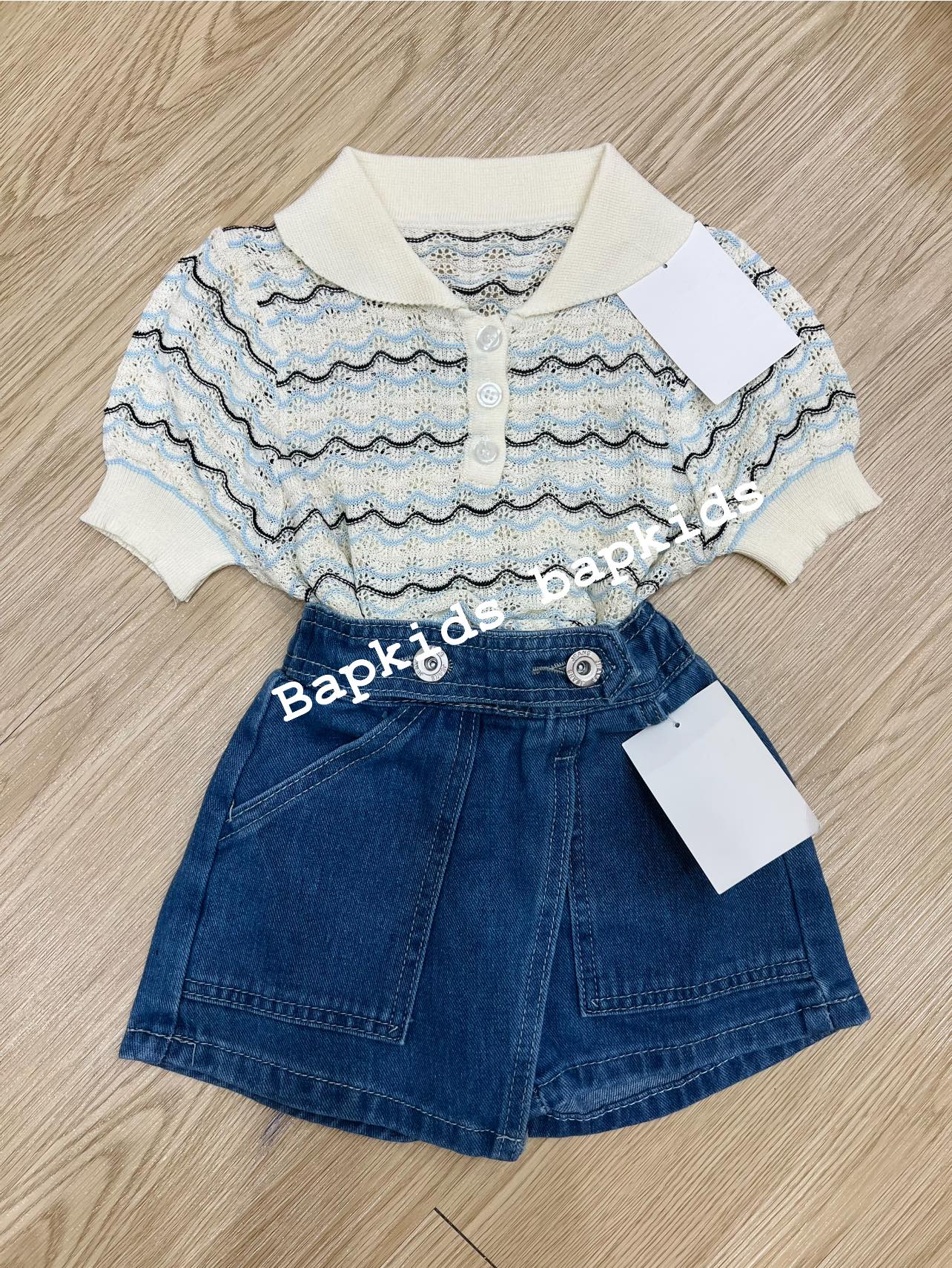 Set này áo thì chất montoghi lỗ thoáng,tay bồng nhẹ, chiếc cổ cực xênh, quần denim giả váy, chất mềm cực kỳ lun ạ