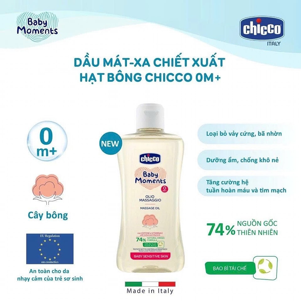 Mát-xa giúp bé ngủ ngon, mau lớn và khỏe mạnh: mát-xa giúp tăng cường hoạt động của hệ tuần hoàn máu và tim mạch, giúp các cơ của bé linh hoạt hơn, phát triển nhanh và mau lớn hơn. Dầu masege Chicco chiết xuất hạt bông với các thành phần chiết xuất từ thiên nhiên giúp loại bỏ các bụi bẩn, bã nhờn, nhẹ nhàng làm sạch da bé. Sản phẩm không chứa cồn và chất tạo màu, không hương liệu, không parabens, không petroleum, không dẫn xuất paraffin, không gây kích ứng da giúp mẹ an tâm khi sử dụng cho bé.