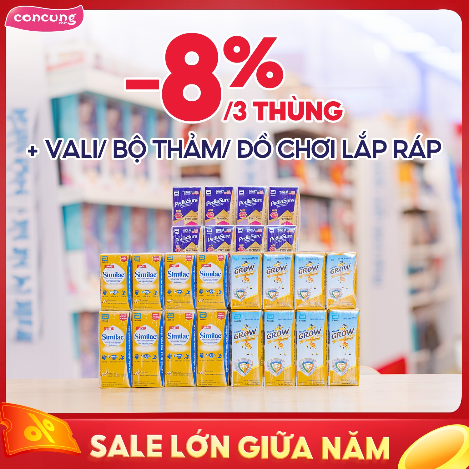 🔹 Similac – Abbott Grow – Pediasure: Mua 1 thùng giảm 6%, 3 thùng giảm 8% + quà xinh…