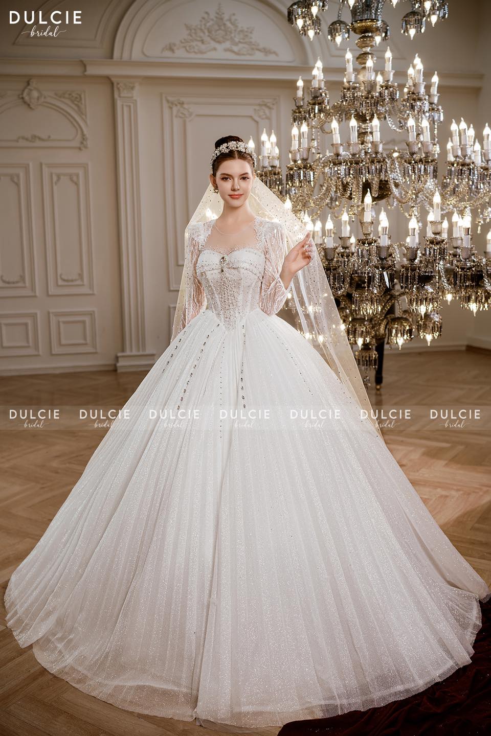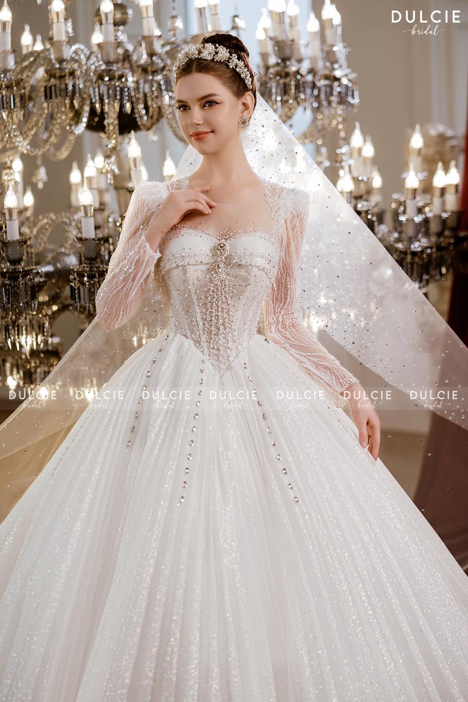 Khép lại cuộc hành trình cùng nàng đi tìm chiếc váy cưới trong mơ với BST Váy Cưới công chúa 𝐃𝐫𝐞𝐚𝐦𝐥𝐢𝐠𝐡𝐭, 𝑬𝒍𝒍𝒆 với phiên bản dài tay được Dulcie Bridal lựa chọn trang trọng gửi tới nàng. Chiếc váy xinh xắn tinh khôi với hoạ tiết tập trung ở phần thân trên, sử dụng kỹ thuật cắt lớp chồng lên nhau biến hoá thành một chiếc nơ nâng niu vòng 1 của nàng, kết hợp với cầu vai nhô lên được cách điệu với chất ren cao cấp tạo hiệu ứng giúp toàn bộ cơ thể thật thon gọn, nhẹ nhàng một cách tự nhiên, tinh tế nhất.