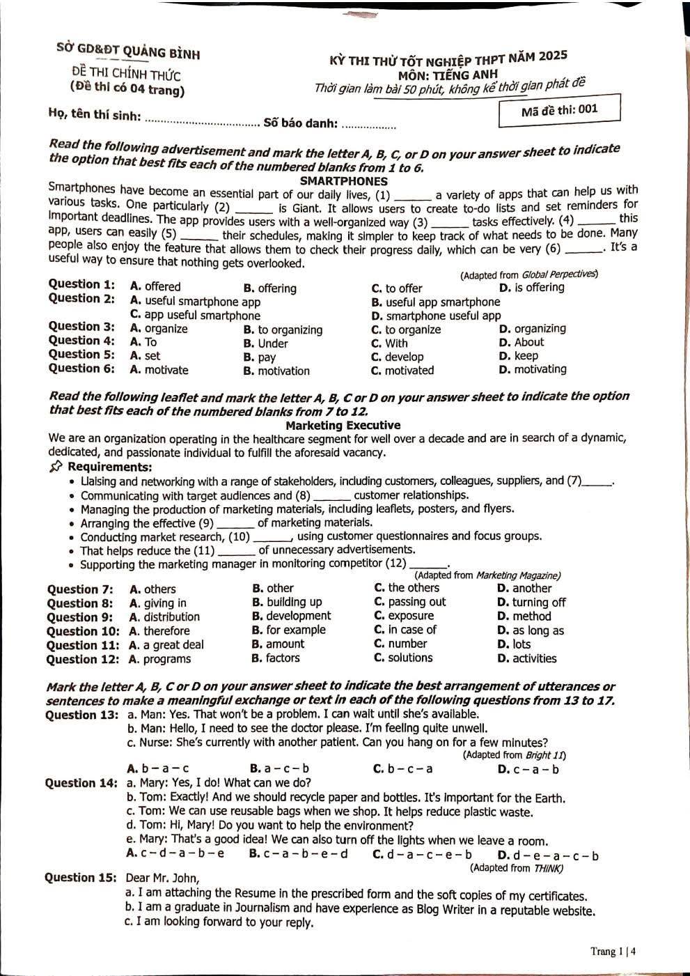 🔥 ĐỀ HOT: UPDATE ĐỀ THI THỬ THPTQG 2025 SỞ QUẢNG BÌNH