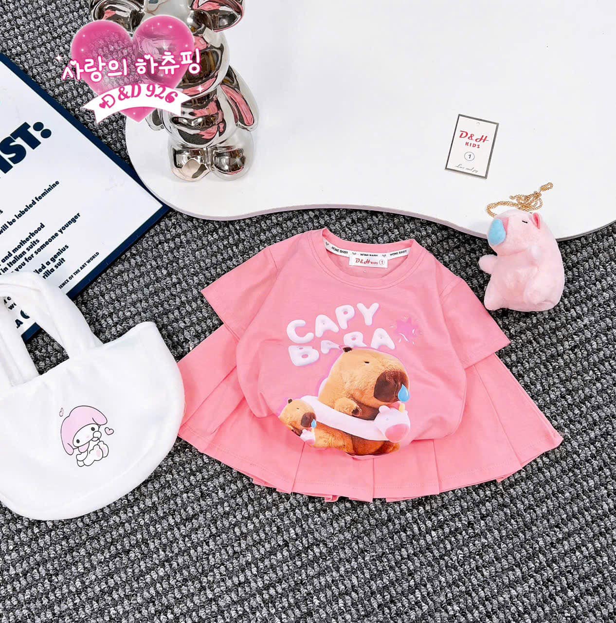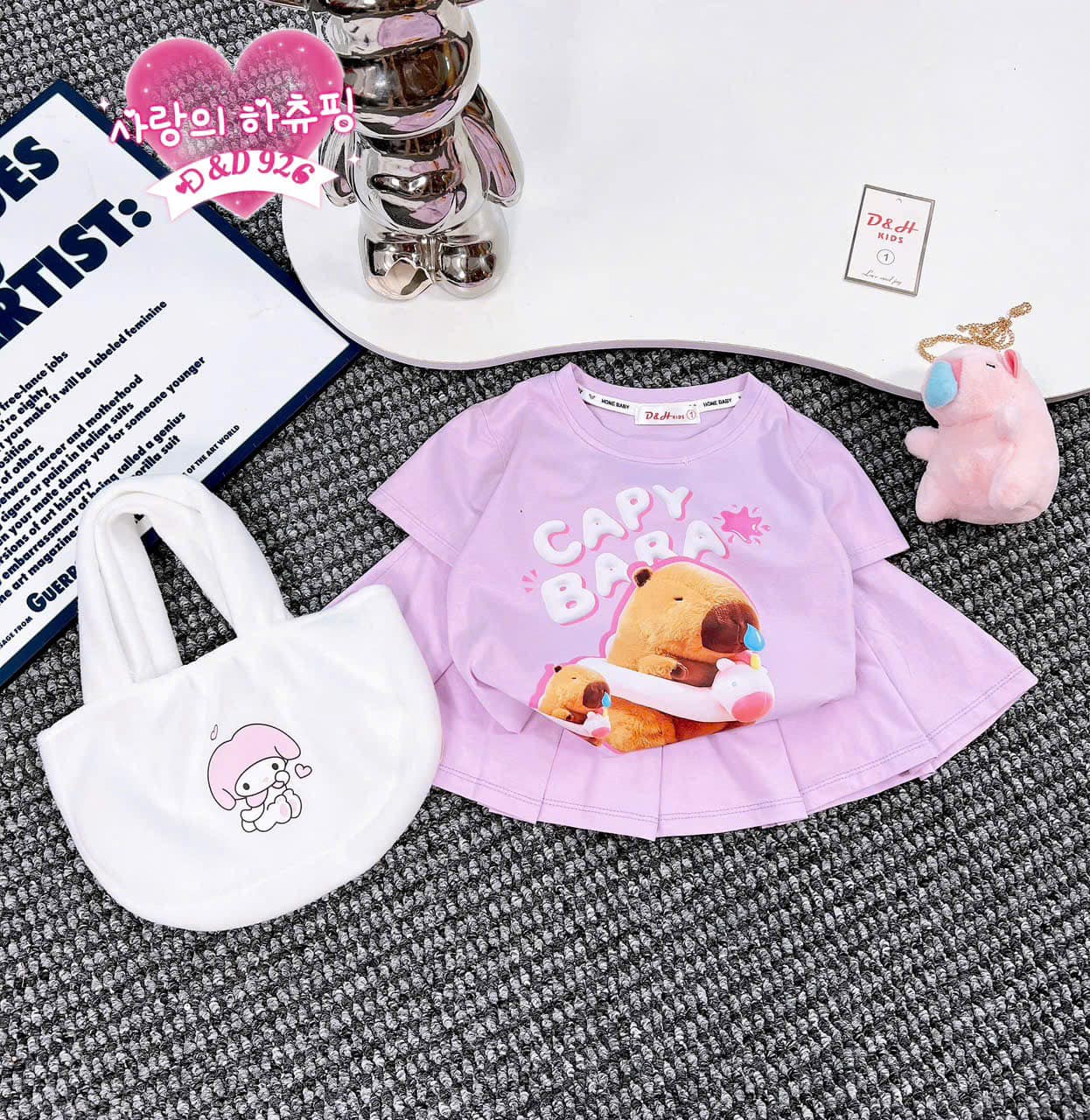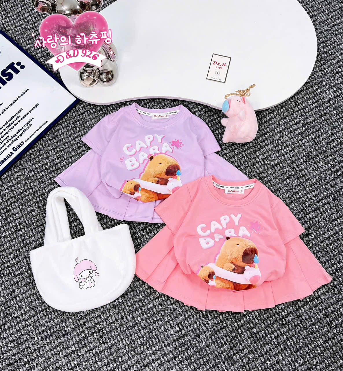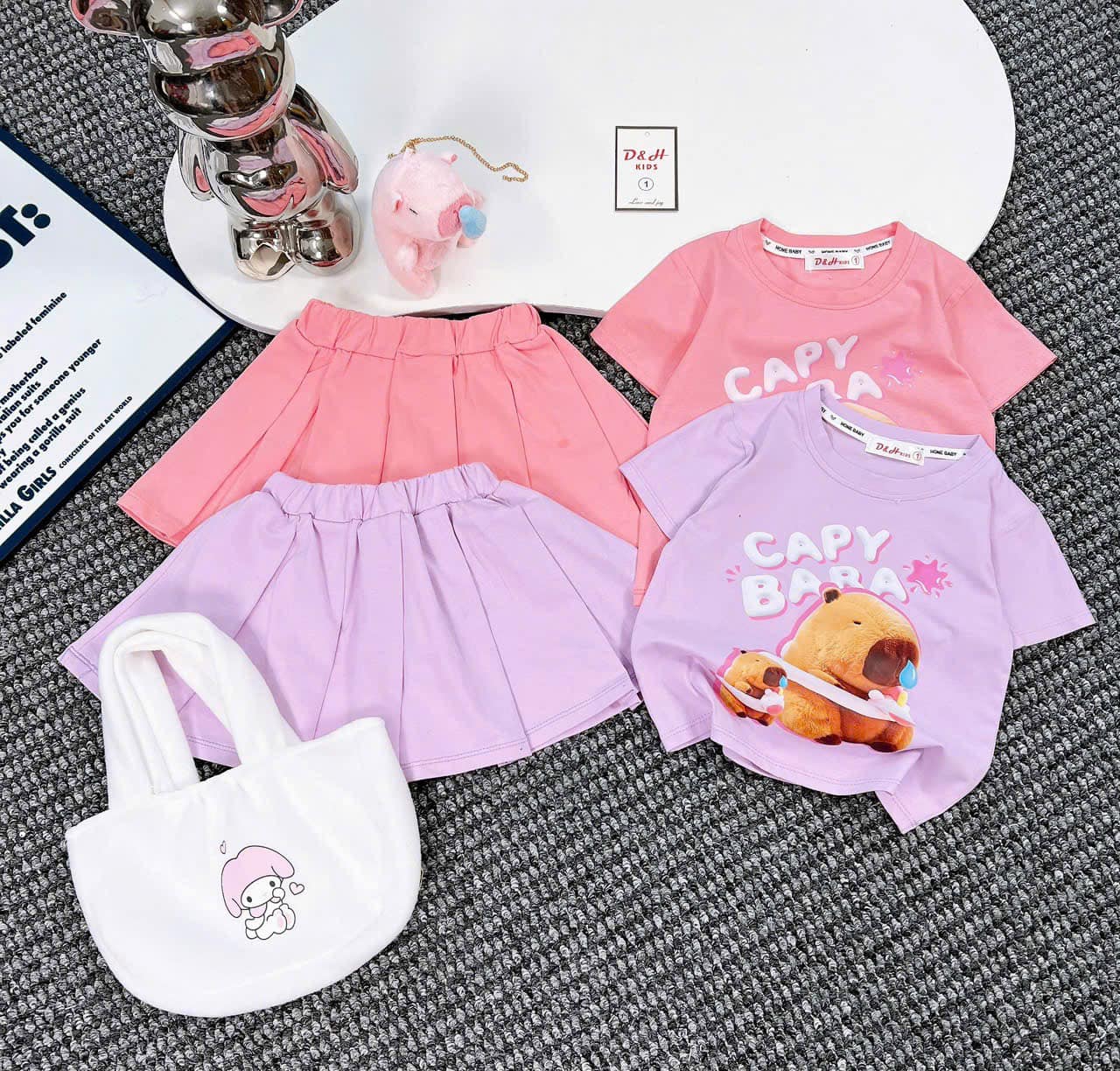Sét gồm : 1 chân váy , 1 áo cotton , 1 thúi lông cầm tay và 1 chú gấu capy bara đeo xinh xắn