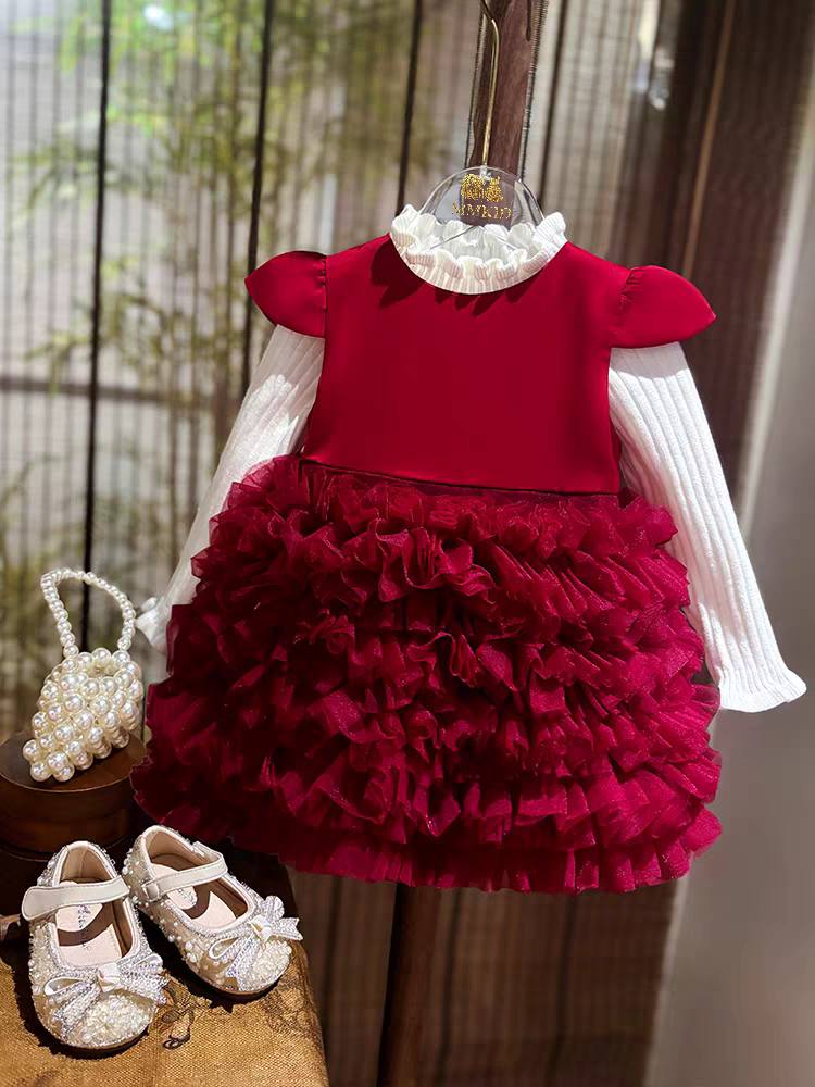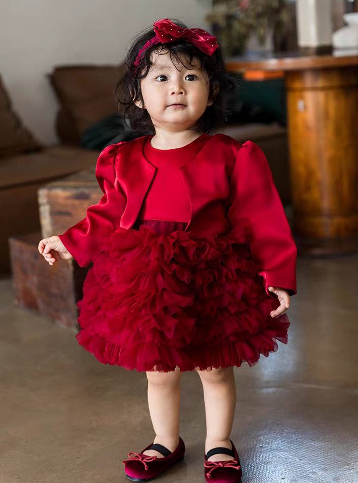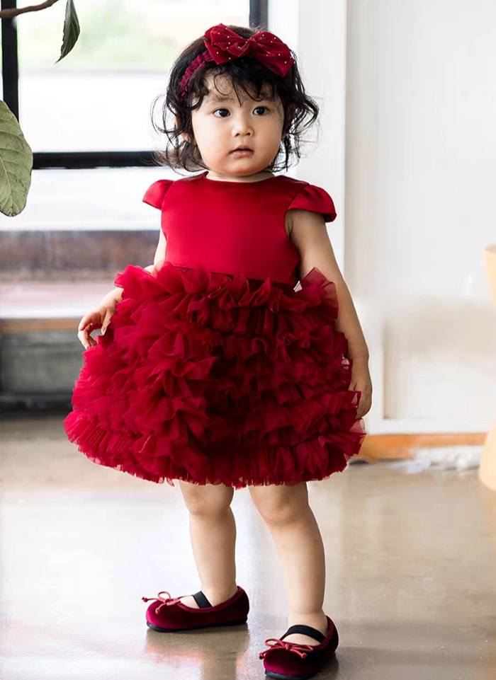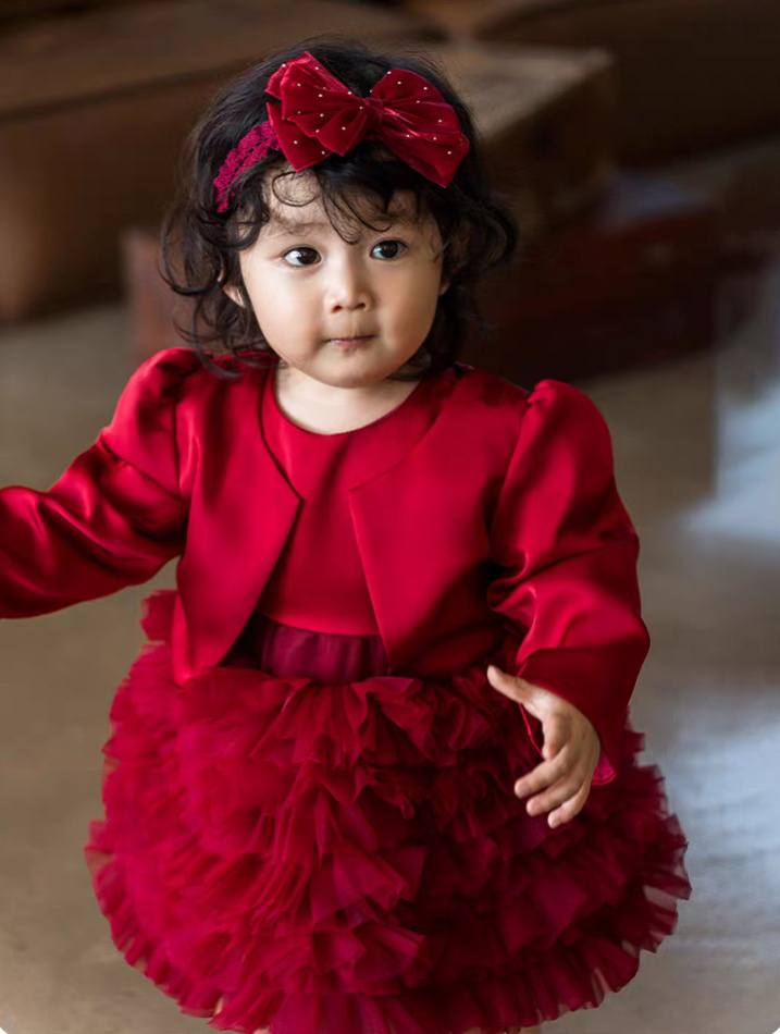 Chiếc váy đỏ đính kèm áo khoác ton-sur-ton là thiết kế partywear thượng lưu dành cho bé gái. Phần thân trên sử dụng Duchess Satin Ý cao cấp, bề mặt mịn bóng như lụa, lên màu đỏ ruby sâu sang trọng. Chân váy là tầng tulle Hàn nhập khẩu nhiều lớp bồng xoè 3D, tạo hiệu ứng như “đám mây nhung đỏ”, đi tiệc nhìn nổi bật và cuốn hút tuyệt đối. Form chuẩn baby princess, mềm, thoáng, an toàn cho da bé.