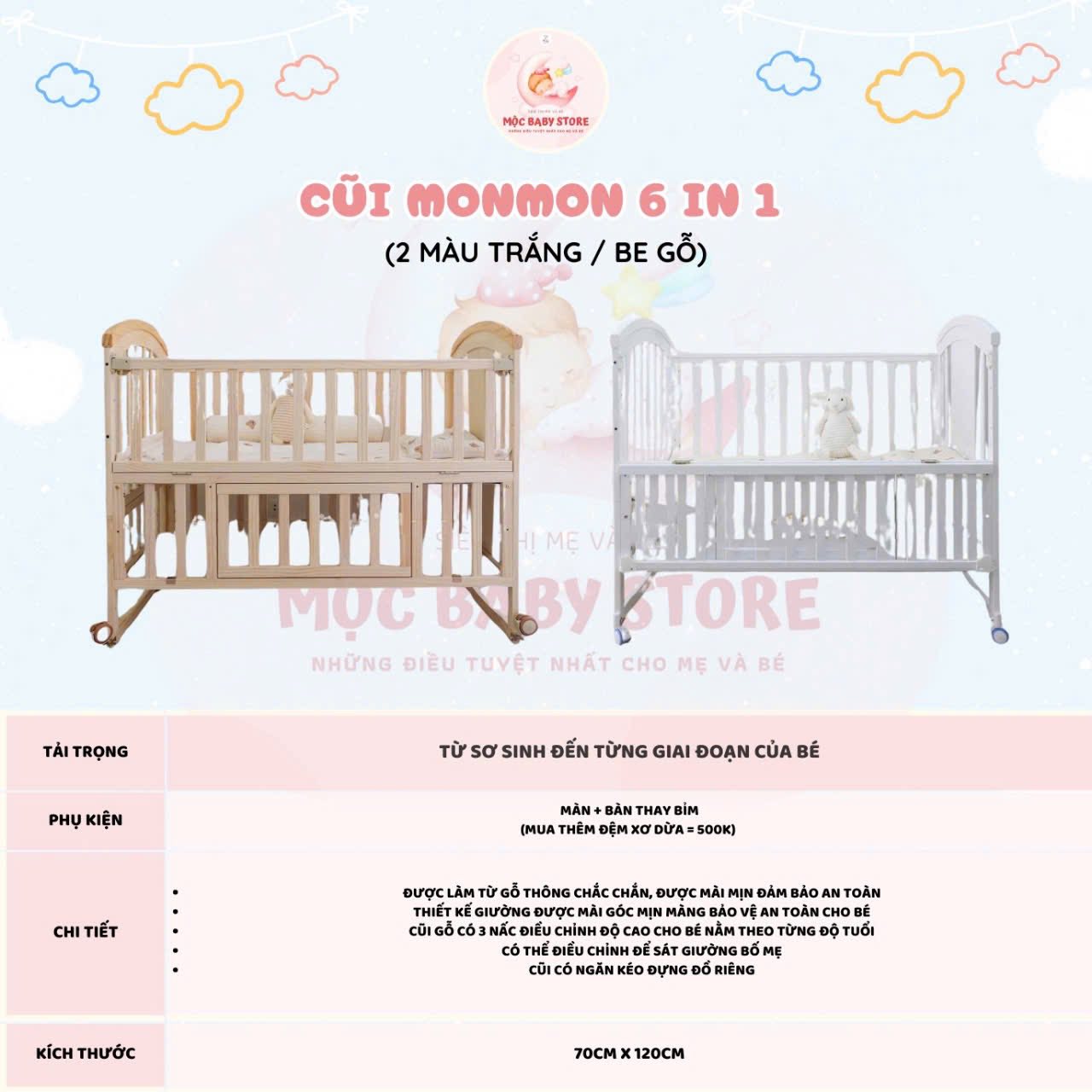👉 Cũi gỗ Monmon 6 in1 Nâu Be và Trắng