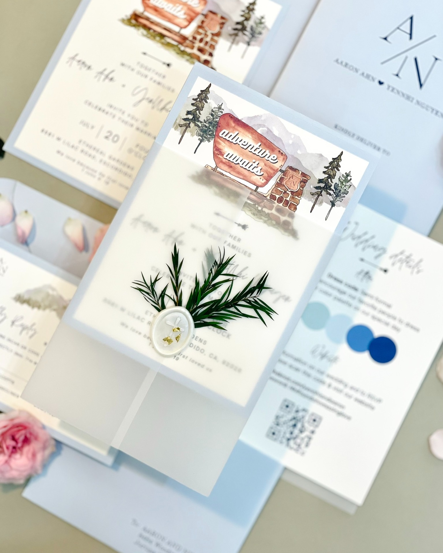 Thiệp cưới được thiết kế với tone xanh dịu trang nhã, mang đậm hơi thở thiên nhiên, hòa hợp hoàn hảo với concept tiệc cưới sân vườn. Mr. & Mrs. Ahn chọn hình ảnh rừng thông làm điểm nhấn, mang ý nghĩa đặc biệt với cặp đôi nên đã tinh tế kết hợp dấu sáp đính lá thông xanh tạo nên tổng thể đầy cảm xúc.