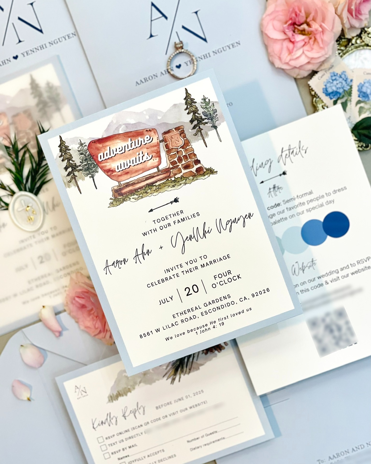 #Thiệp #cưới #được #thiết #kế #với #tone #xanh #dịu #trang #nhã #mang #đậm #hơi #thở #thiên #nhiên #hòa #hợp #hoàn #hảo #với #concept #tiệc #cưới #sân #vườn #Ahn #chọn #hì