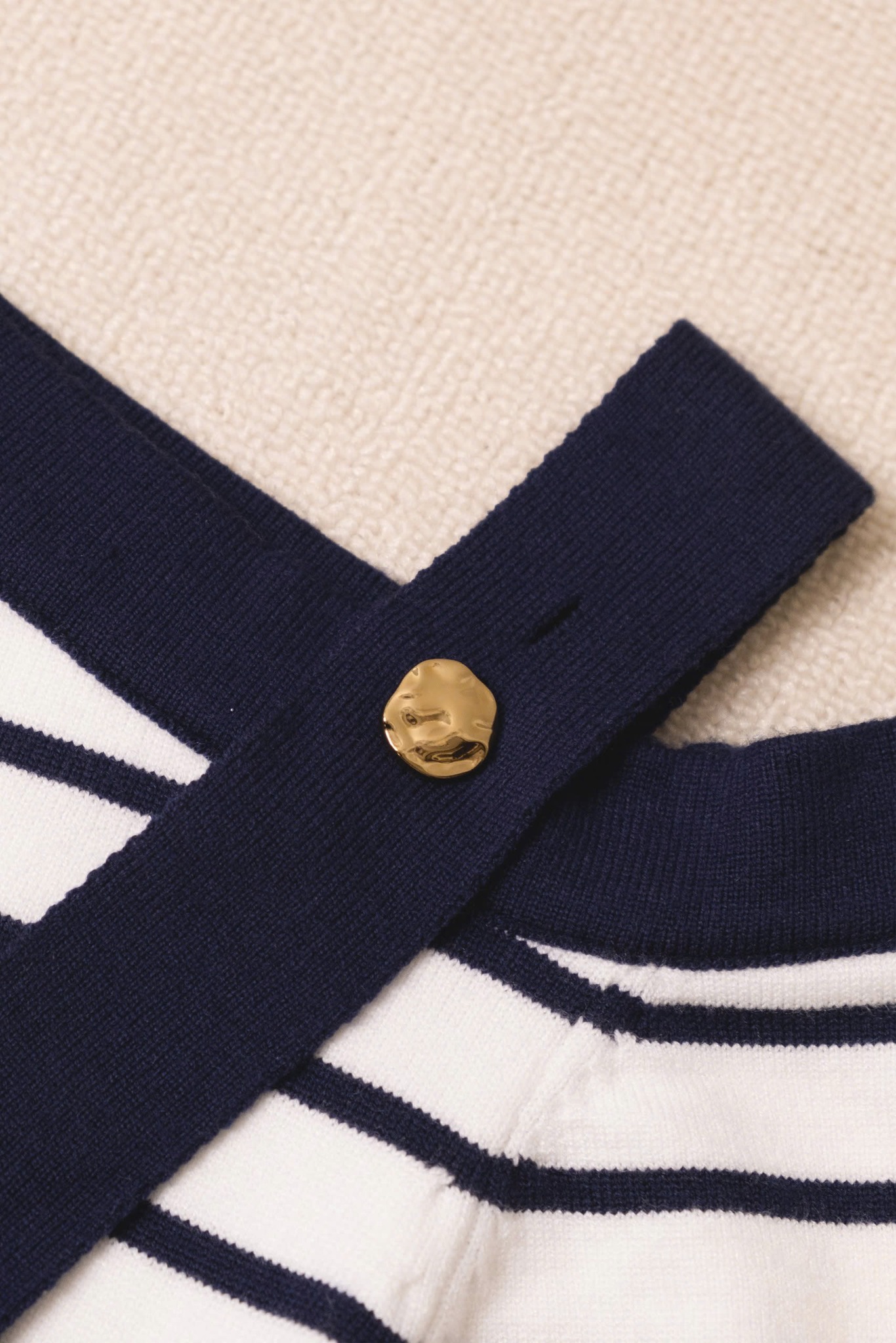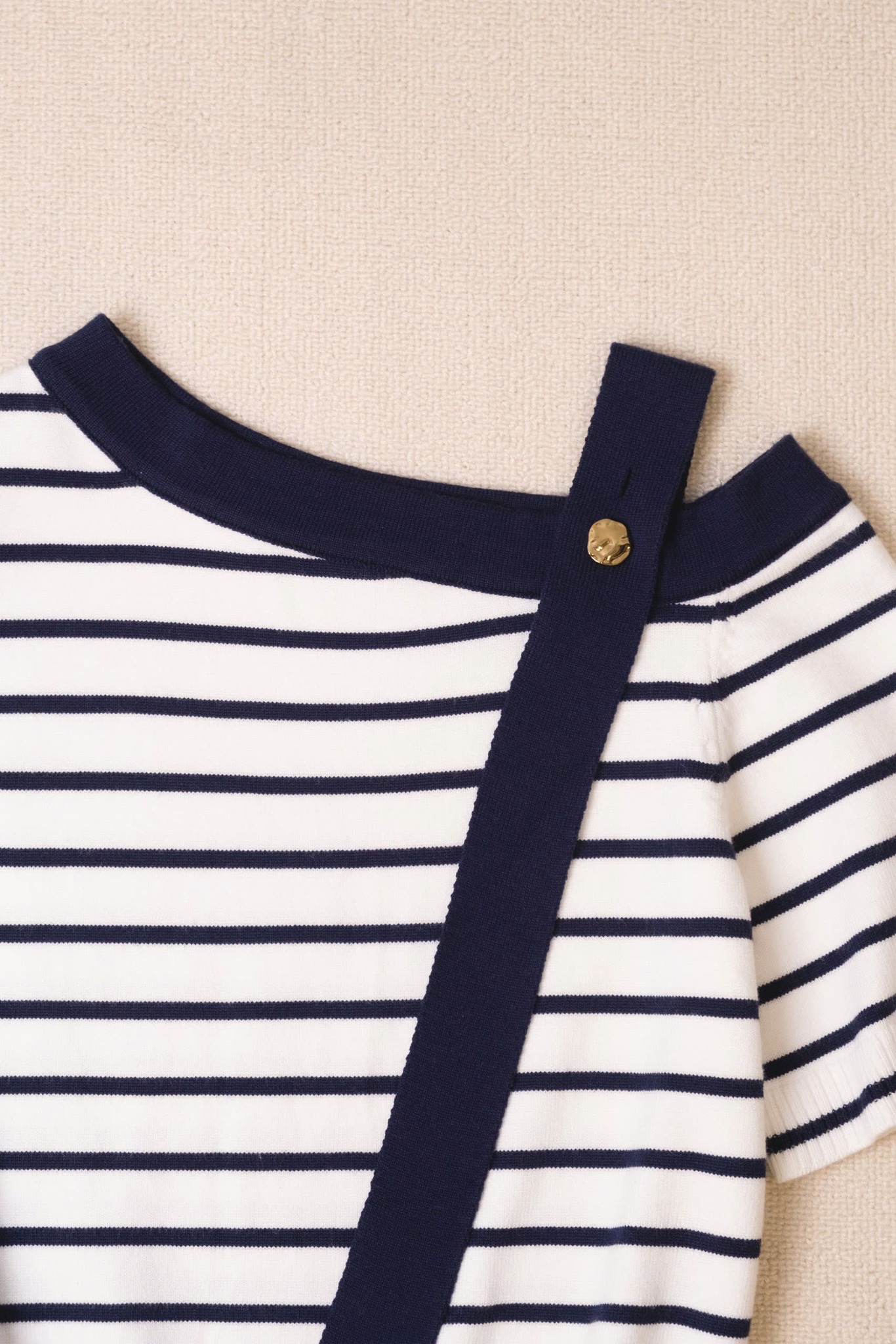 Mẫu áo dệt kim ngắn tay lệch vai phối cúc kim loại đầy phá cách nhưng vô cùng hiện đại. Tone màu trắng phối kẻ xanh than tạo nên kiểu dáng thanh lịch và nữ tính. Thiết kế lệch vai phối dây dễ dàng giúp người mặc che được khuyết điểm.