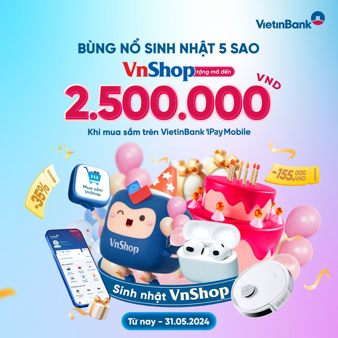 SINH NHẬT 5 SAO VNSHOP – ƯU ĐÃI CỰC WOWHàng ngàn ưu đãi 5 sao đã đổ bộ trên VietinBank iPay Mobile. Nhập tiệc sinh nhật, Mua sắ , shares-20✔️ , likes-77K❤️️ , date-2024-05-15 19:00:32🇻🇳🇻🇳🇻🇳📰🆕](https://scontent-dus1-1.xx.fbcdn.net/v/t15.5256-10/427772260_1248279659889937_7434640674613764324_n.jpg?stp=cp0_dst-jpg_e15_q65_s526x395&_nc_cat=102&ccb=1-7&_nc_sid=c396b0&efg=eyJpIjoiYiJ9&_nc_ohc=NMTNyawe6osQ7kNvgF39Z3V&_nc_ht=scontent-dus1-1.xx&gid=AI-N070pgZVprHb6Xibrtec&oh=00_AYAxkvXsSbzFwQaBe0sk9cCwBoK4RLkoe-4oHzy9UlOcIg&oe=66B09335)