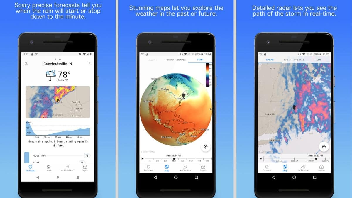Dark Sky, một trong những ứng dụng dự báo thời tiết hàng đầu, có khả năng cung cấp thông tin chi tiết và chính xác đến từng phút. Điều đặc biệt khiến Dark Sky nổi bật là việc sử dụng radar để dự đoán lượng mưa và thời tiết theo từng phút, mang lại khả năng dự báo độ chính xác cao.