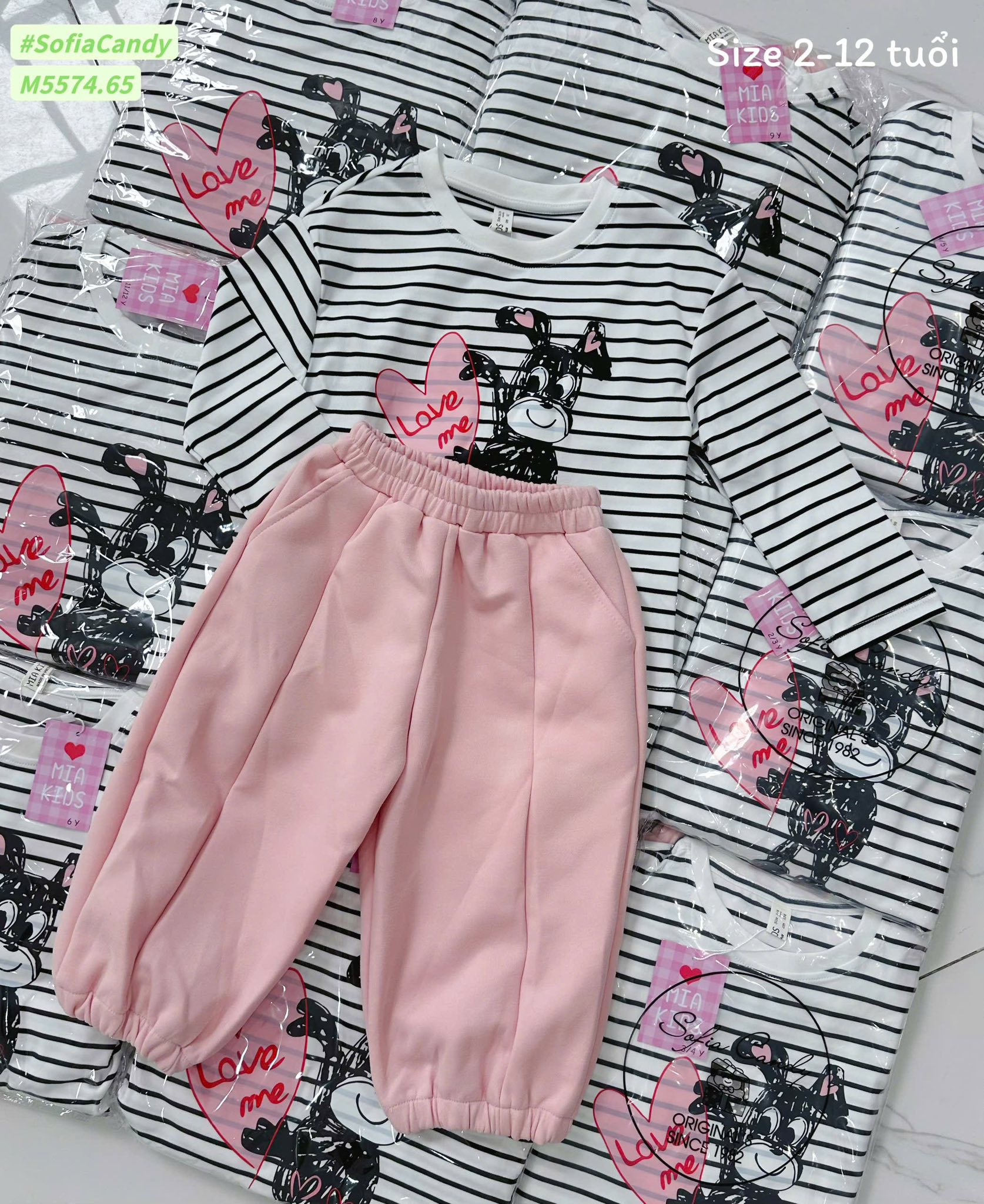 M5574 – Set bộ Mia Kids áo kẻ đen + quần nỉ hồng bé gái size 2-12y
