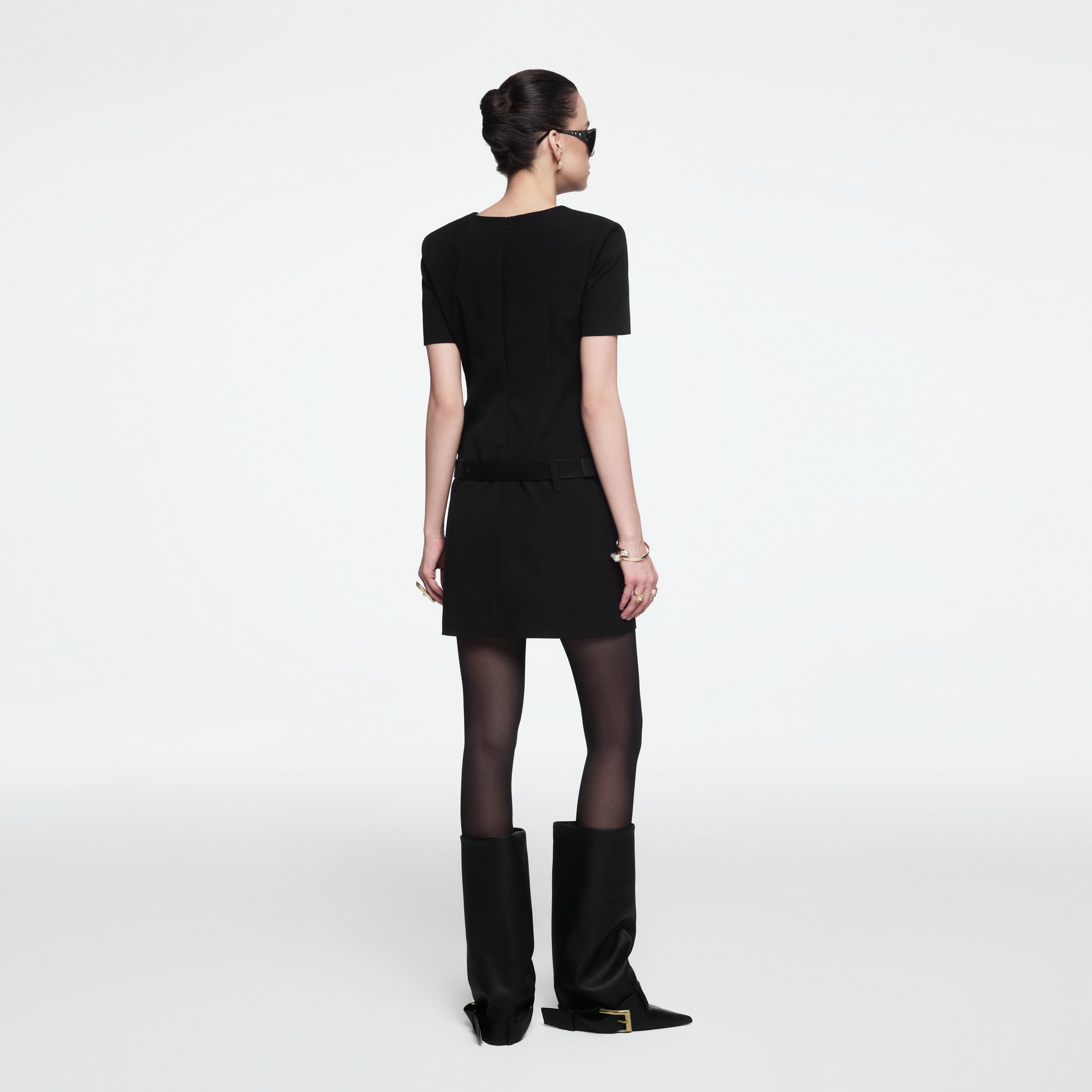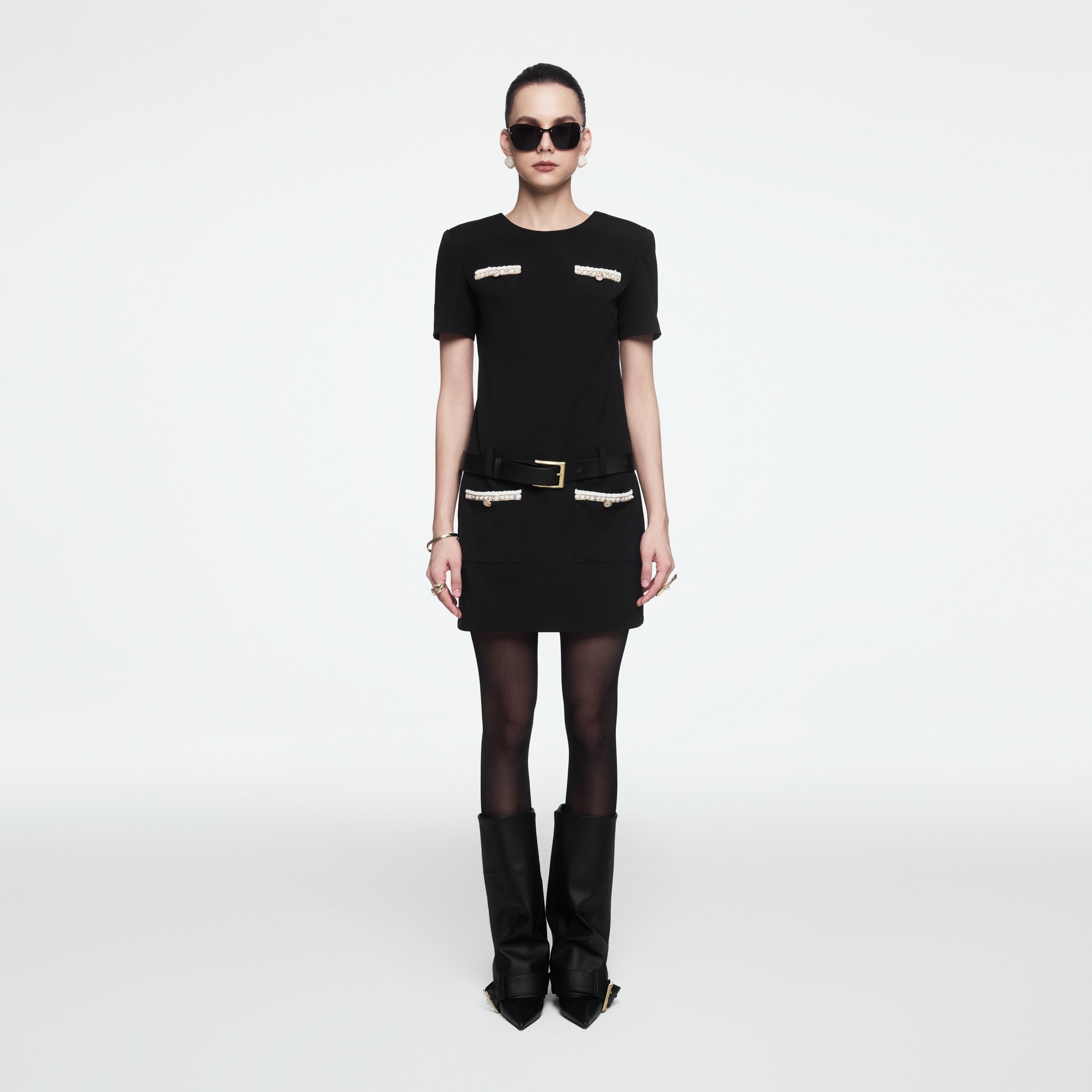 The classic black dress is reinterpreted through considered detailing: tweed-trimmed flap pockets, polished metal buttons and a statement belt that defines the waist, adding structure and modernity to the silhouette.