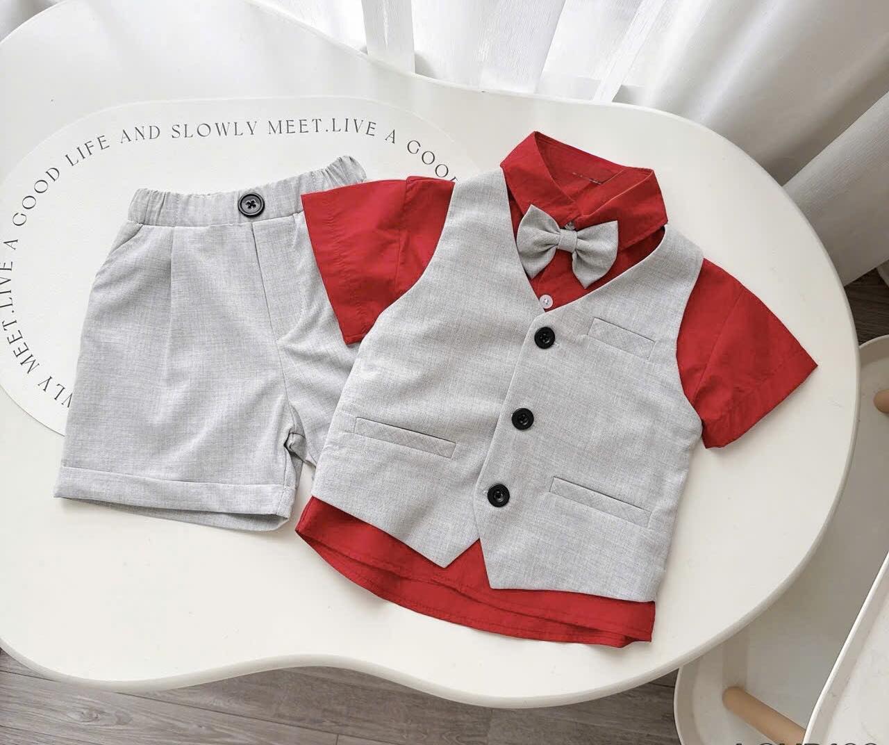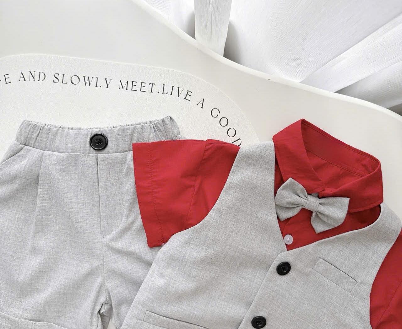 🍭Thiết kế set 4 chi tiết gồm: áo gile mix quần short lưng thun gập gấu tỉ mỉ, áo sơ mi trắng kèm nơ công tử siêu bảnh trai, thanh lịch.