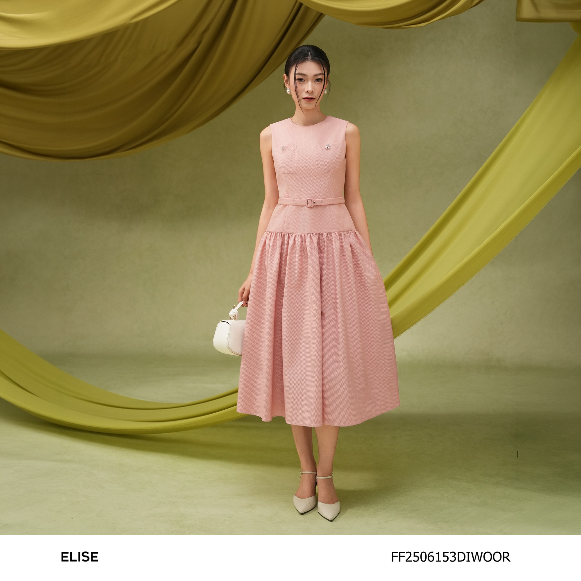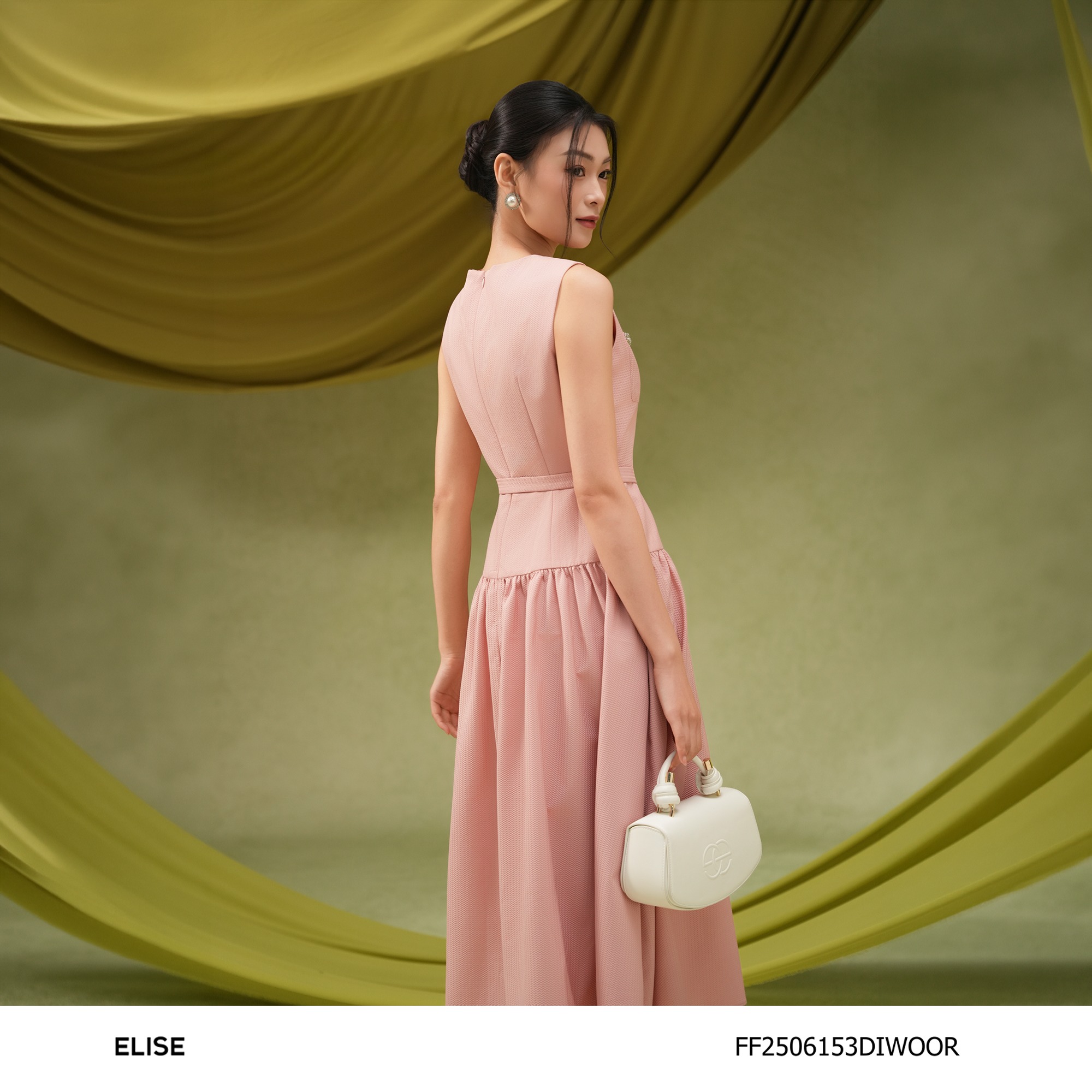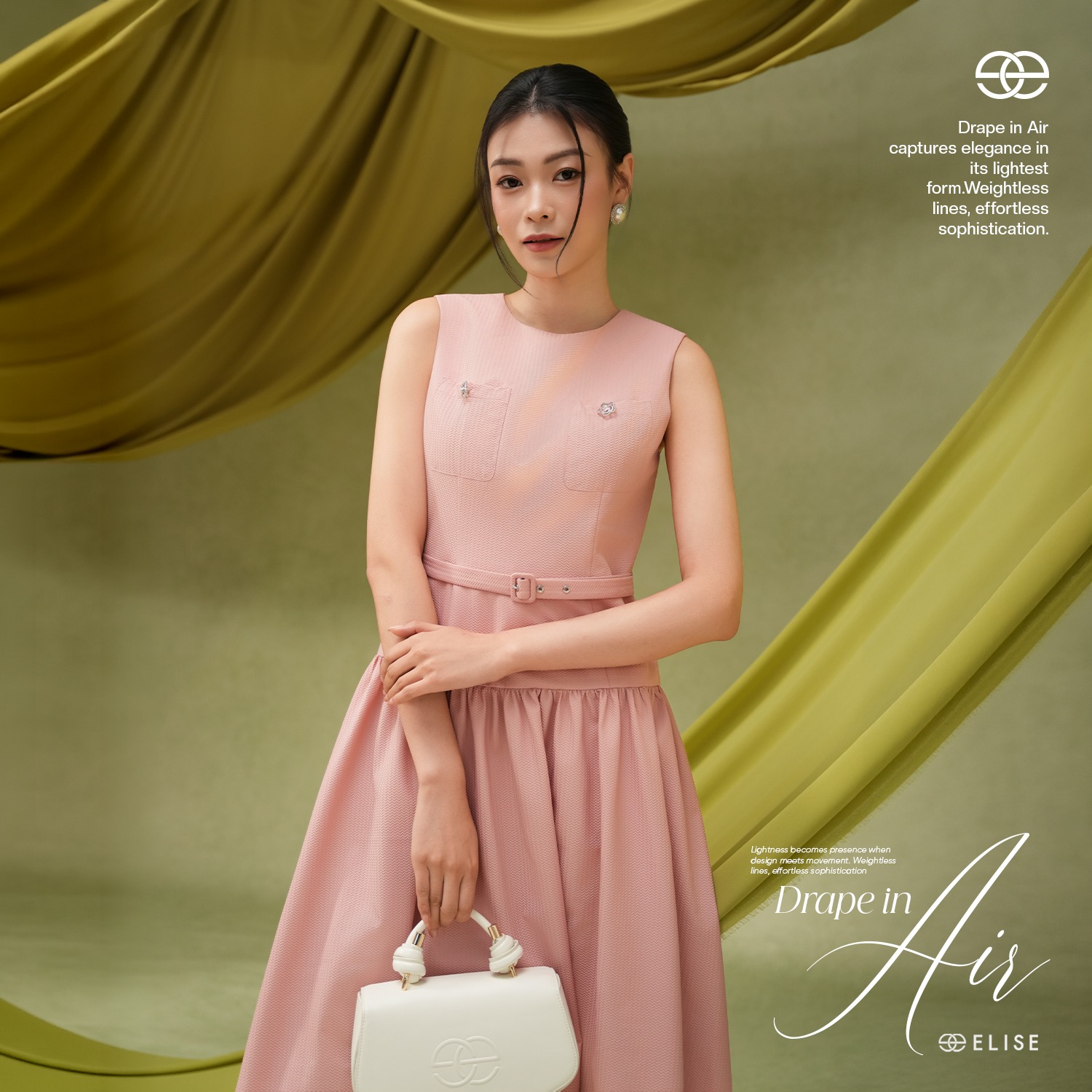 Gam hồng pastel được tiết chế tinh tế, kết hợp cùng đường thắt eo nhẹ và chi tiết nhỏ nhấn nhá, giúp tổng thể giữ được sự nữ tính thanh lịch – đúng tinh thần Drape In Air: nhẹ, thoáng và đầy cảm xúc mùa xuân.